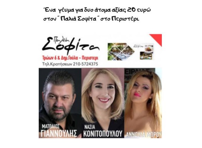 Η Παλιά Σοφίτα στο Περιστέρι διοργανώνει διαγωνισμό και σας δίνει τη δυνατότητα να κερδίσετε 2 γευματα με ελεύθερη επιλογή από τον κατάλογο, συνολικής αξίας 40€!