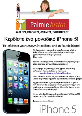 Το Palmie bistro διοργανώνει διαγωνισμό και σας δίνει τη δυνατότητα να κερδίσετε ένα iPhone 5.