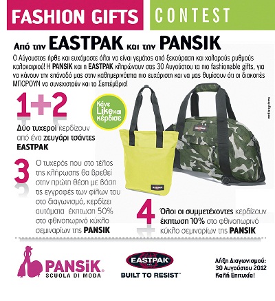 Η σελίδα PANSIK scuola di moda διοργανώνει διαγωνισμό και σας δίνει τη δυνατότητα να κερδίσετε 2 ζευγάρια τσάντες EASTPAK.