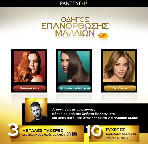 Η σελίδα Pantene Greece διοργανώνει διαγωνισμό και σας δίνει τη δυνατότητα να κερδίσετε 3 σετ με συσκευές μαλλιών Braun (1 πιστολάκι μαλλιών και 1 κεραμικό σίδερο ισιώματος Satin Hair 7) και 10 πακέτα με προϊόντα μαλλιών Pantene Pro-V (1 σαμπουάν, 1 conditioner και 1 μάσκα μαλλιών της σειράς Αναδόμηση και Προστασία).