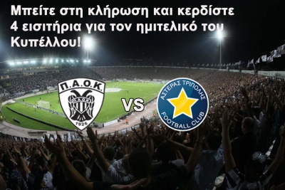 Το paokweb.gr διοργανώνει διαγωνισμό και σας δίνει τη δυνατότητα να κερδίσετε 4 εισιτήρια για τον ημιτελικό του Κυπέλλου Ελλάδας, ΠΑΟΚ – Αστέρας Τρίπολης που θα διεξαχθεί την Τετάρτη 17/04 στο γήπεδο της Τούμπας.