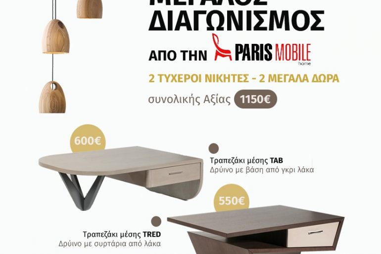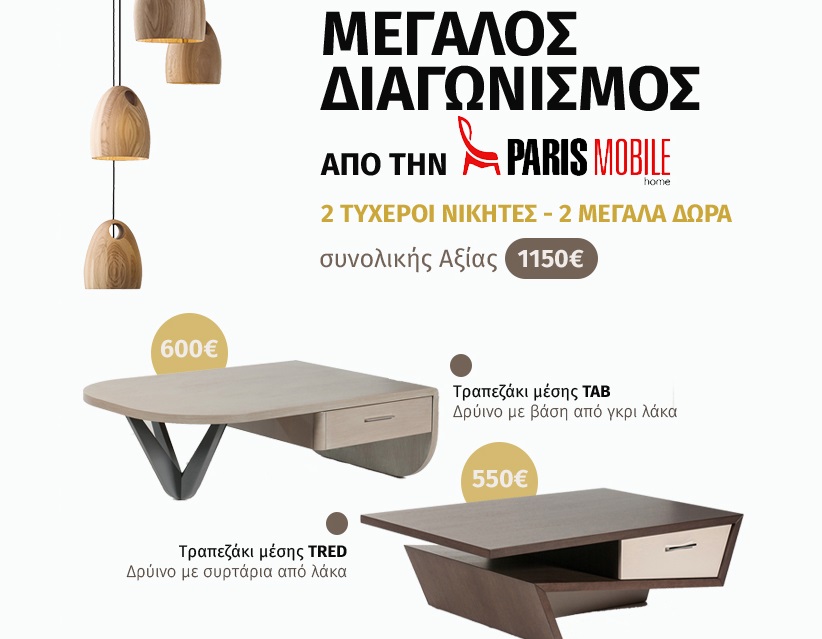 H Paris Mobile Home διοργανώνει διαγωνισμό και δίνει τη δυνατότητα σε 2 τυχερές να κερδίσουν από ένα υπέροχο τραπεζάκι μέσης, αξίας 550€ και 600€ αντίστοιχα!