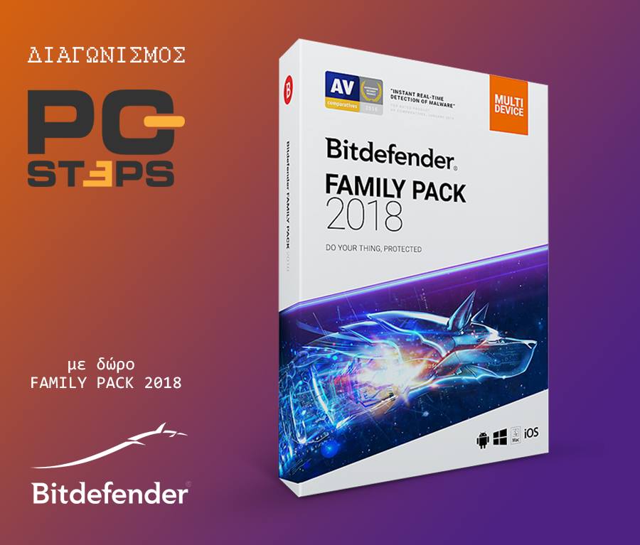 To PC Steps διοργανώνει διαγωνισμό και σας δίνει τη δυνατότητα να κερδίσετε 10 ετήσιες άδειες του κορυφαίου προϊόντος Bitdefender Family Pack 2018 που καλύπτει απεριόριστους υπολογιστές, κινητά, και tablet, με λειτουργικά συστήματα Windows, Android, και macOS!