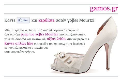 Το gamos.gr διοργανώνει διαγωνισμό και σας δίνει τη δυνατότητα να κερδίσετε ένα ζευγάρι peep toe γόβες Mourtzi από μεταξωτό σατέν, γαλλική δαντέλα και swarovski αξίας 240€.