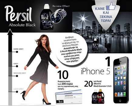 Η σελίδα Persil διοργανώνει το διαγωνισμό “Persil Absolute Black” και σας δίνει τη δυνατότητα να κερδίσετε ένα iphone5, 10 δωροεπιταγές των 200 ευρώ για τις εορταστικές σας αγορές και 20 set Persil.