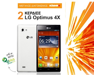 To ΠΛΑΙΣΙΟ διοργανώνει διαγωνισμό και δίνει τη δυνατότητα σε 2 τυχερούς να κερδίσουν ένα μαύρο LG Optimus 4X HD μαζί με χάρτες Ginius Driver-Don’t Panic ο πρώτος νικητής και ένα λευκό LG Optimus 4X HD μαζί με χάρτες Ginius Driver-Don’t Panic ο δεύτερος νικητής.