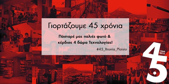 Το ΠΛΑΙΣΙΟ κλείνει 45 χρόνια & το γιορτάζει με φωτογραφικό διαγωνισμό! Πόσταρε στον τοίχο του παλιές φωτογραφίες που σας θυμίζουν Πλαίσιο ή gadgets «αρχαιολογίες», κινητά «παντόφλες», «προϊστορικά» είδη γραφείου με hashtag και κερδίστε 1 Τurbo-X Laptop Turbo-X Flynote GT u5-450, 1 Turbo-X TV 55” TXV-5523SMT, 1 Turbo-X Smartphone Ω και 1 δωροεπιταγή αξίας 100€ για αγορές από τα καταστήματα Πλαίσιο.