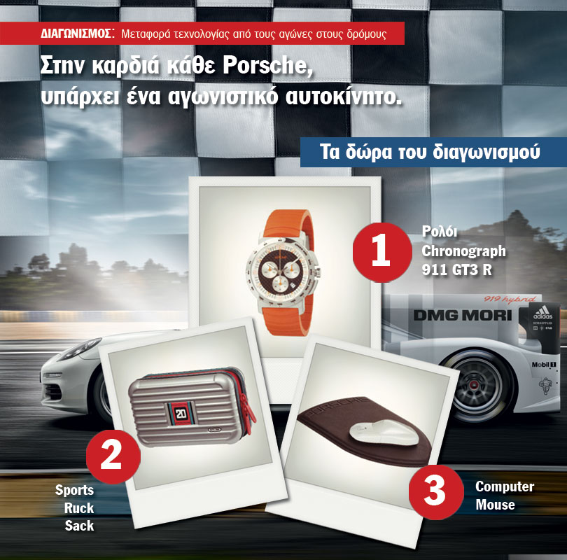 Η σελίδα Porsche hellas διοργανώνει διαγωνισμό και δίνει τη δυνατότητα στον πρώτο νικητή να κερδίσει ένα ρολόι Chronograph 911 GT3 R , στους 2 επόμενους νικητές από ένα νεσεσέρ Rimowa και στους επόμενους τρεις από ένα ασύρματο mouse!