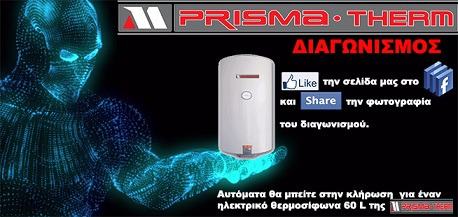 Η εταιρία Prisma-Therm διοργανώνει διαγωνισμό και σας δίνει τη δυνατότητα να κερδίσετε έναν ηλεκτρικό θερμοσίφωνα 60L PRISMA-THERM (εσωτερικό δοχείο από χάλυβα DX-51/Z140 πάχους 2,5mm με εσωτερική επίστρωση ρητίνης τιτανίου).