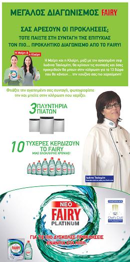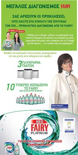 Το Fairy διοργανώνει διαγωνισμό και σας δίνει τη δυνατότητα σε 3 τυχερούς να κερδίσουν από ένα πλυντήριο πιάτων και σε 10 ακόμα να κερδίσουν προϊόντα Fairy για ένα χρόνο.