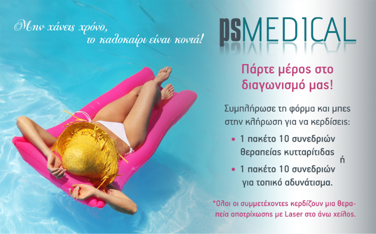 Η σελίδα psmedical.gr διοργανώνει διαγωνισμό και σας δίνει τη δυνατότητα να κερδίσετε 10 συνεδρίες κυτταρίτιδας ή τοπικού αδυνατίσματος!