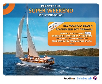 Το Read Point διοργανώνει διαγωνισμό στο facebook και σας καλεί να γράψετε με comment ποια είναι η αγαπημένη σας παραλία, να συγκεντρώσετε τα περισσότερα likes μέχρι τις 6/7 στις 14:00 και να κέρδισε συνδρομή στο αγαπημένο σας περιοδικό για όλο το 2012. Στις 12 Ιουλίου τα 10 comments με τα περισσότερα likes θα μπουν σε κλήρωση και ο νικητής θα κερδίσει ένα super ΣΚ με ιστιοπλοϊκό για δύο άτομα.