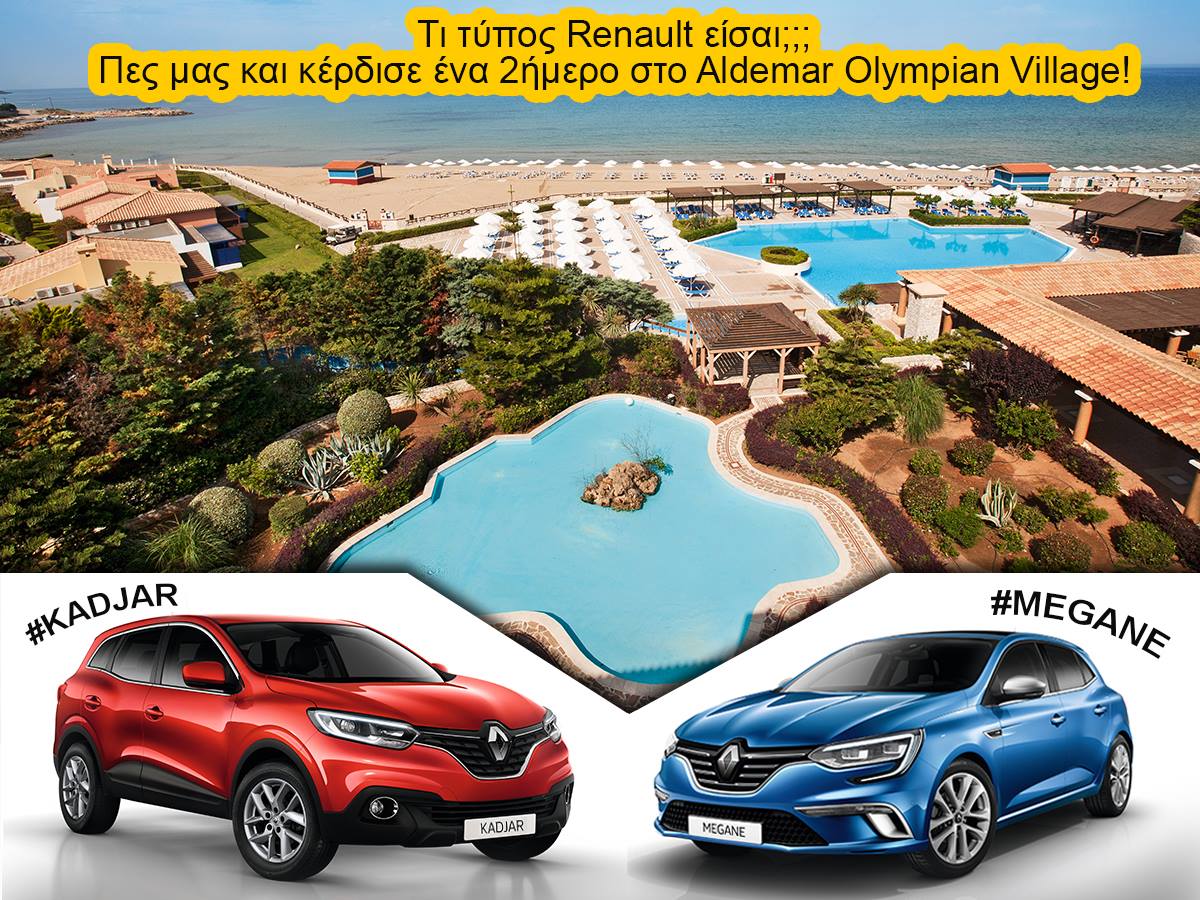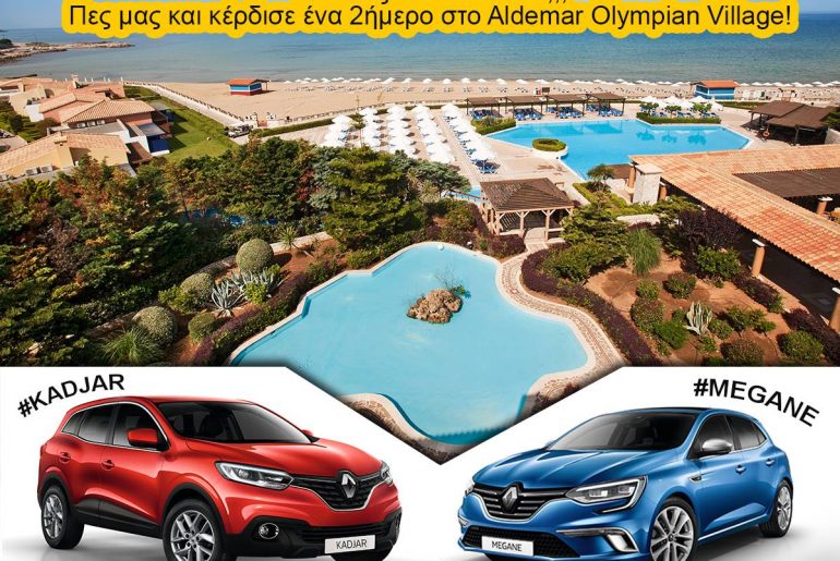 H Renault διοργανώνει διαγωνισμό και σας δίνει τη δυνατότητα να κερδίσετε ένα αυτοκίνητο (Megane ή Kadjar) με γεμάτο ρεζερβουάρ για 2 ημέρες (Σάββατο 23/9-Κυριακή 24/9) και μια διανυκτέρευση All Inclusive το Σάββατο 23/9 στο Ξενοδοχείο Aldemar Olympian Village στη Σκαφιδιά του Πύργου Ηλείας!