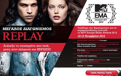 Η Replay διοργανώνει διαγωνισμό και σας δίνει τη δυνατότητα να κερδίσετε αεροπορικά εισιτήρια μετ’ επιστροφής για δύο άτομα από Αθήνα προς Φρανκφούρτη, διαμονή 2 ημερών σε δωμάτιο δύο ατόμων στο ξενοδοχείο Hilton της Φρανκγφούρτης και είσοδο για 2 άτομα στα MTV EMA 2012.