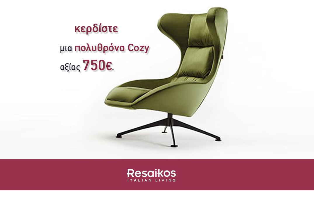 Η Resaikos Italian Living διοργανώνει διαγωνισμό και σας δίνει τη δυνατότητα να κερδίσετε μία πολυθρόνα Cozy, αξίας 750€!