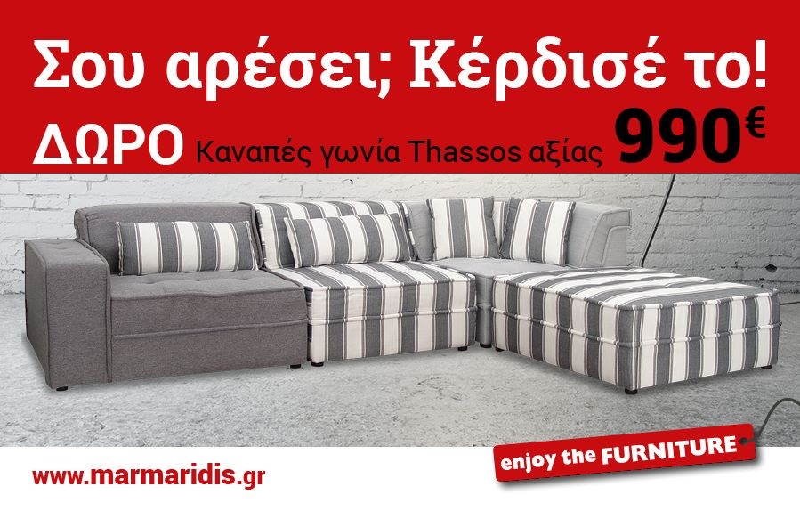 Τα Έπιπλα Μαρμαρίδης διοργανώνουν διαγωνισμό και σας δίνουν τη δυνατότητα να κερδίσετε ένα γωνιακό καναπέ Thassos, αξίας 990€!