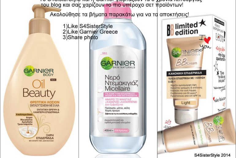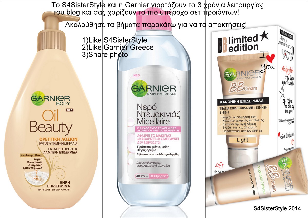 Το S4SisterStyle σε συνεργασία με τη Garnier χαρίζουν από ένα σετ 3 προϊόντων που περιλαμβάνει την αγαπημένη σας Garnier BB Cream σε ανανεωμένη έκδοση,το νερό ντεμακιγιάζ Micellaire και το γαλάκτωμα oil beauty, σε 3 τυχερούς!