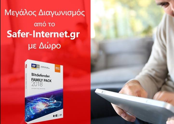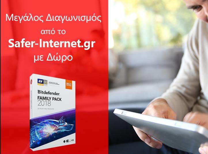 Η σελίδα Safer-Internet.Gr και η Bitdefender Greece διοργανώνουν διαγωνισμό και δίνουν τη δυνατότητα σε 10 τυχερούς να κερδίσουν την σουίτα ασφαλείας Bitdefender Family Pack 2018, συνολικής αξίας 500€, για πλήρη προστασία της οικογένειας σας από ηλεκτρονικές απειλές και με βελτιωμένο γονικό σύμβουλο. Καλύπτει απεριόριστες συσκευές, για ένα χρόνο και είναι συμβατή με Windows, Mac OS , iOS και Android smartphones και tablets!
