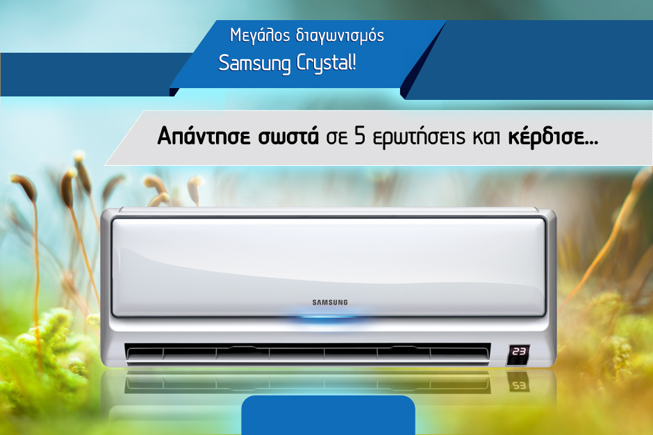 Η Samsung διοργανώνει διαγωνισμό και σας προσφέρει ένα κλιματιστικό Samsung Crystal. Απαντήστε σωστά σε 5 ερωτήσεις, συμπληρώστε τα στοιχεία σας και κερδίστε μια συμμετοχή. Η κλήρωση θα πραγματοποιηθεί την Παρασκευή 26 Ιουλίου 2013.