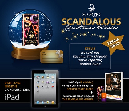 Η σελίδα Scorpio σας καλεί να μπείτε στην εφαρμογή “Scorpio Xmas Snowball”, να γράψετε τη χριστουγεννιάτικη ευχή για ένα φίλο σας και να μπείτε στην κλήρωση για ένα άρωμα Scorpio Scandalous και τον οδηγό για φλερτ κάθε μέρα και ένα ipad στη μεγάλη κλήρωση στο τέλος του διαγωνισμού.