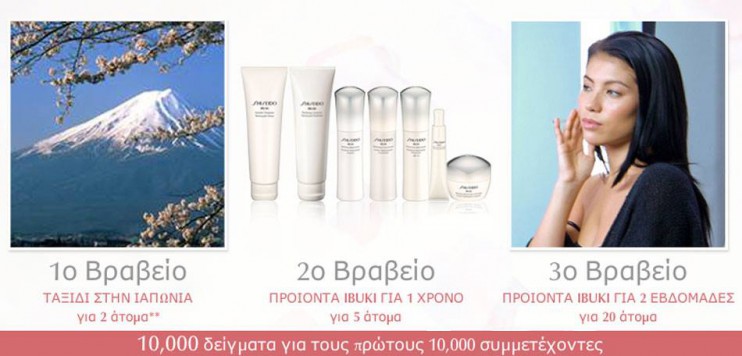 Η Shiseido Greece διοργανώνει διαγωνισμό και σας δίνει τη δυνατότητα να κερδίσετε ένα ταξίδι για 2 στην Ιαπωνία, 5 σετ προϊόντων Ibuki, 3 σετ μινι προϊόντων Ibuki και δείγματα δωρεάν.
