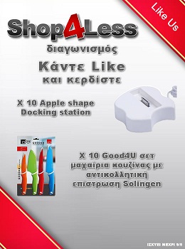 Το Shop4less διοργανώνει διαγωνισμό και σας δίνει τη δυνατότητα να κερδίσετε 10 Apple shape Docking station και 10 Good4U σετ μαχαίρια κουζίνας με αντικολλητική επίστρωση Solingen.