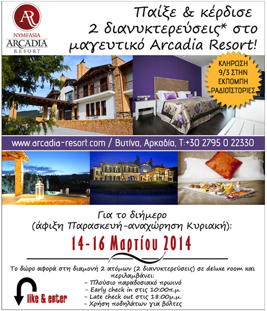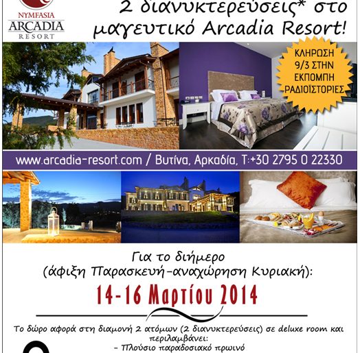 To Sin Radio και το Arcadia Resort προσφέρουν ένα υπέροχο διήμερο(14-16 Μαρτίου) σε ένα τυχερό ζευγάρι!