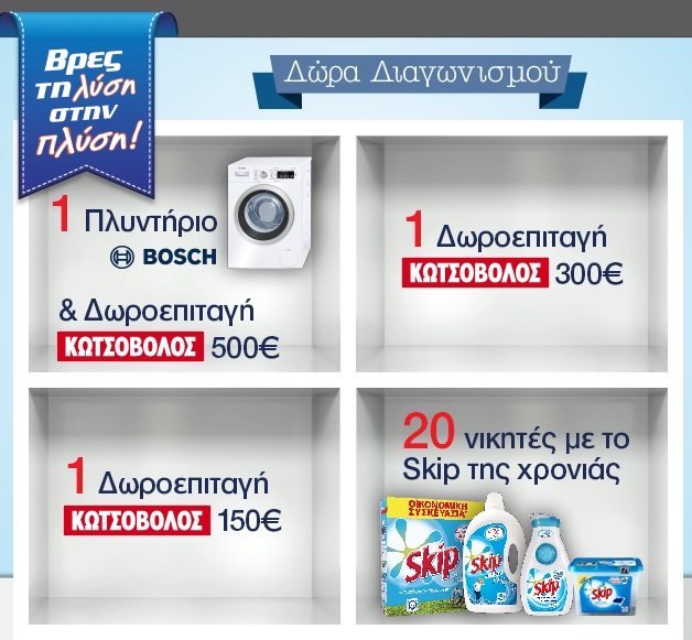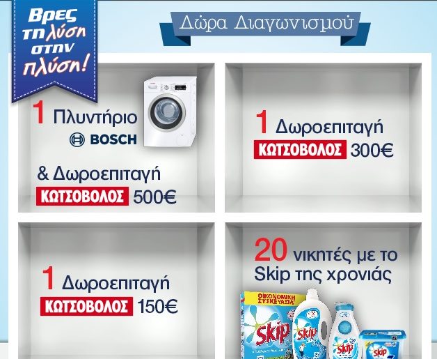 Διαγωνισμός Skip με δώρο προϊόντα Skip, δωροεπιταγές Κωτσόβολος και ένα πλυντήριο Bosch