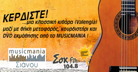 Το sokfm.gr διοργανώνει διαγωνισμό και σας δίνει τη δυνατότητα να κερδίσετε μια κλασική κιθάρα (VALENGIA), μαζί με τη θήκη μεταφοράς της, καθώς και κουρδιστήρι και DVD Εκμάθησης από το Musicmania (Αβάντων 74), θα γίνουν δικά σου, με τον πιο εύκολο τρόπο.