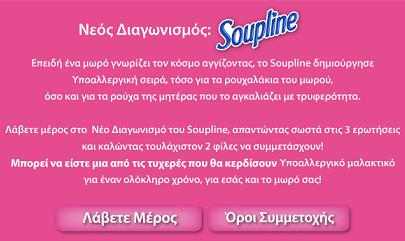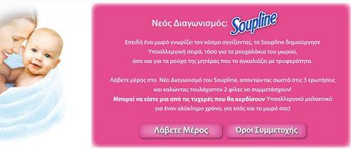 Το Soupline διοργανώνει διαγωνισμό και σας δίνει τη δυνατότητα να κερδίσετε τρία (3) μαλακτικά ρούχων Soupline Υποαλλεργικό 750ml και τέσσερα (4) μαλακτικά ρούχων Soupline Softness & Wellbeing, που αντιστοιχούν σε περισσότερο από την ποσότητα μαλακτικού ρούχων που καταναλώνει κατά μέσο όρο ένα ελληνικό νοικοκυριό σε διάστημα ενός (1) χρόνου (σύμφωνα με στοιχεία Homepanel της εταιρείας AC Nielsen για το χρονικό διάστημα 2010) ανά συμμετέχοντα-νικητή.