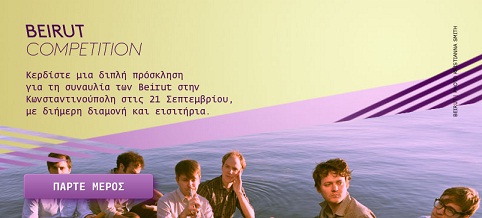 Η Στέγη Γραμμάτων & Τεχνών διοργανώνει διαγωνισμό και σας δίνει τη δυνατότητα να κερδίσετε 2 εισιτήρια για την συναυλία των Beirut στην Turkcell Kuruçeşme Arena της Κωνσταντινούπολης στις 21 Σεπτεμβρίου 2012, μαζί με 2 αεροπορικά εισιτήρια με επιστροφή για την Κωνσταντινούπολη και δυο διανυκτερεύσεις σε ξενοδοχείο τεσσάρων αστέρων.