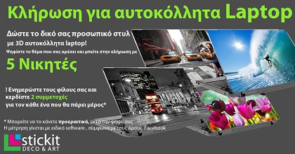 Το Stickit.gr διοργανώνει διαγωνισμό και σας δίνει τη δυνατότητα να κερδίσετε 5 3D αυτοκόλλητα laptop για να δώσετε το δικό σας στυλ στο Laptop σας και να το προστατέψετε από φθορές.