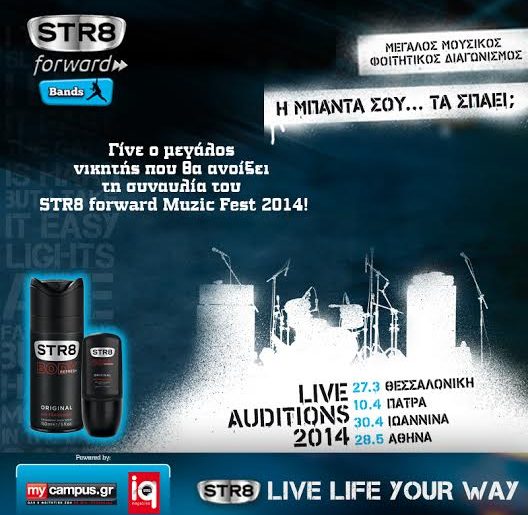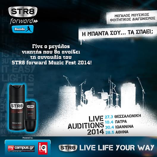 Ο διαγωνισμός του STR8 «STR8 Bands» σε προσκαλεί να δηλώσεις συμμετοχή με την μπάντα σου και να φτάσεις μέχρι τον τελικό της Θεσσαλονίκης και το STR8 forward Muzic Fest. Η νικητήρια μπάντα θα έχει την ευκαιρία να ανοίξει τη συναυλία του STR8 forward Muzic Fest, το καλοκαίρι, στην Τεχνόπολις, στο Γκάζι.