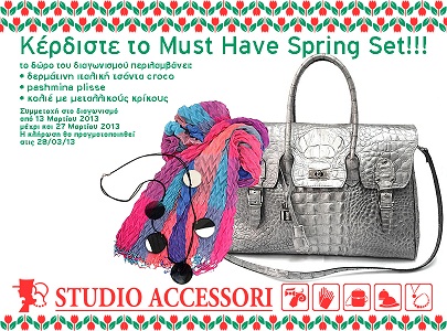 Η σελίδα Studio Accessori διοργανώνει διαγωνισμό και σας δίνει τη δυνατότητα να κερδίσετε ένα «Must Have Spring Set» (περιλαμβάνει μία δερμάτινη ιταλική τσάντα croco, μία pashmina plisse, ένα κολιέ με μεταλλικούς κρίκους), συνολικής αξίας 200,00 €.