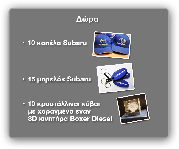 Η σελίδα Subaru Greece διοργανώνει διαγωνισμό και δίνει τη δυνατότητα σε 10 τυχερούς να κερδίσουν από 1 καπέλο Subaru, σε άλλους 15 από 1 μπρελόκ Subaru και σε άλλους 10 από 1 κρυστάλλινο κύβο με σκαλισμένο έναν κινητήρα Boxer Diesel.