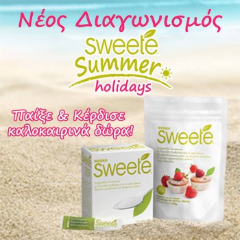 Η σελίδα Sweete Stevia διοργανώνει το διαγωνισμό «Sweete Summer Holidays» και δίνει τη δυνατότητα σε ένα νικητή να κερδίσει 1 παγωτομηχανή Μoulinex, σε 10 νικητές που να κερδίσουν από μια τσάντα παραλίας με προϊόντα Sweete και σε 20 ακόμα νικητές να κερδίσουν από μια πετσέτα Sweete.