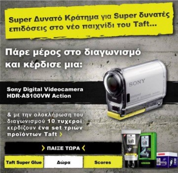 Η σελίδα Taft Styling διοργανώνει διαγωνισμό και δίνει τη δυνατότητα σε ένα τυχερό να κερδίσει μια Sony Digital Videocamera HDR‐AS100VW Action και σε 3 ακόμη τυχερούς να κερδίσουν από ένα σετ 3 προιοντων Taft (Super Glue 150ml, Marathon 300ml, Titanium 250ml).