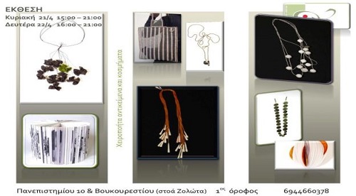 Το Τaλκ και η Λέττα Ανδρεάδη, με αφορμή την έκθεσή της, που θα πραγματοποιηθεί στην Αθήνα την Κυριακή 21 και τη Δευτέρα 22 Απριλίου, Πανεπιστημίου 10 και Βουκουρεστίου (Στοά Ζολώτα, 1ος όροφος), χαρίζουν σε μια τυχερή αναγνώστριά μας ένα όμορφο κολιέ από χαρτί με δερμάτινο λουράκι.