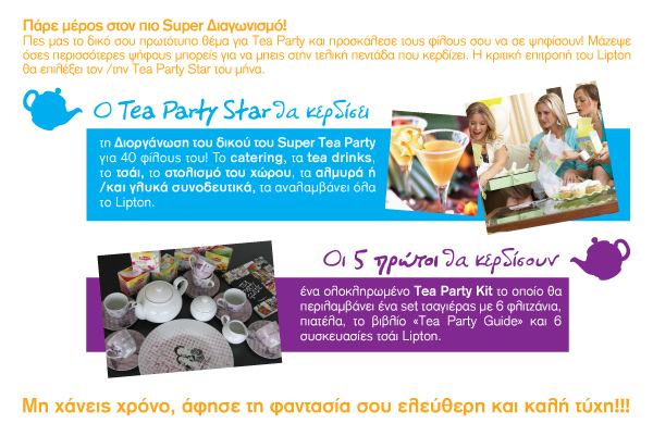 Μπες κι εσύ τώρα στο διαγωνισμό που διοργανώνει η Lipton και γίνε Tea Party Star. Ο Tea Party Star θα κερδίσει τη διοργάνωση του δικού του Super Tea Party για 40 φίλους του με το catering, τα tea drinks, το τσάι, το στολισμό του χώρου, τα αλμυρά ή/και γλυκά συνοδευτικά!