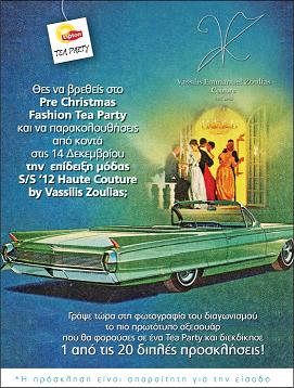 Το Tea Party διοργανώνει διαγωνισμό και σας δίνει τη δυνατότητα να κερδίσετε 20 προσκλήσεις για να βρεθείτε στο Pre Christmas Fashion Tea Party και να παρακολουθήσετε στις 14 Δεκεμβρίου την επίδειξη μόδας του Βασίλη Ζούλια.