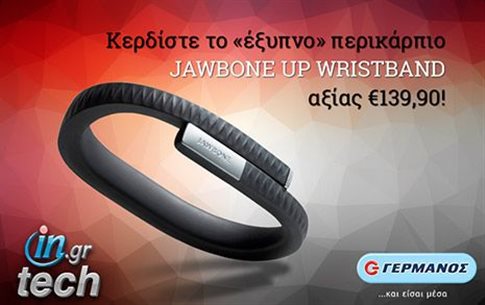 Το Δίκτυο Καταστημάτων ΓΕΡΜΑΝΟΣ προσφέρει σε έναν επισκέπτη του tech.in.gr το αδιάβροχο βραχιόλι Jawbone Up, ένα «έξυπνο» wristband, αξίας 139,90 ευρώ, που σε βοηθάει να κατανοήσεις καλύτερα τις συνήθειες σου στον ύπνο, στην κίνηση σου καθώς και στις διατροφικές σου συνήθειες.