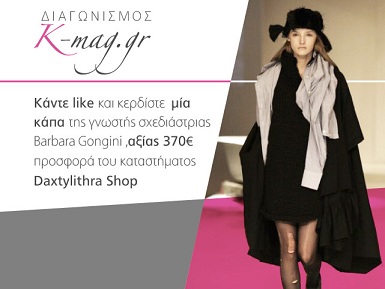 Το The K-Magazine διοργανώνει διαγωνισμό και σας δίνει τη δυνατότητα να κερδίσετε μία κάπα (100%μαλλί) της γνωστής σχεδιάστριας από τη Δανία, Barbara Gongini, αξίας 370,00 ευρώ, προσφορά του καταστήματος Daxtylithra Shop.