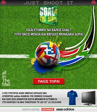 Η σελίδα The Mall Athens διοργανώνει διαγωνισμό στον οποίο κάθε μέρα ο γύρος του παιχνιδιού θα θέτει και από μία καινούργια ερώτηση. Ο πιο γρήγορος χρήστης που θα απαντήσει σωστά στην ερώτηση του γύρου, μόλις αυτός καθίσταται διαθέσιμος, θα κερδίζει αυτόματα μια φανέλα της Εθνικής Ελλάδος Adidas. Όλοι οι χρήστες με σωστές απαντήσεις θα κερδίζουν από μια συμμετοχή στην τελική κλήρωση για μια TV LED 32′ LG 32LS3400.
