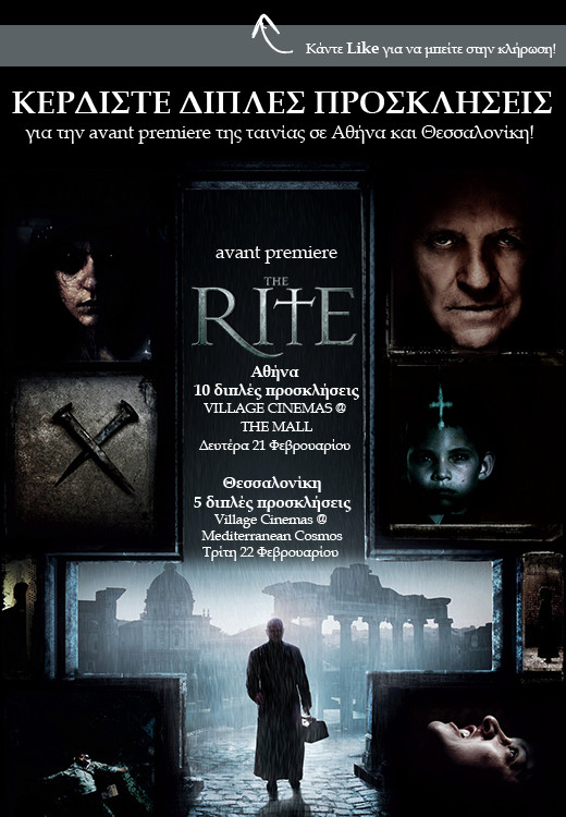Όσοι κάνουν like στην επίσημη σελίδα της ταινίας The Rite (Η Τελετή) μέχρι την Παρασκευή 18/2 στις 12:00 μ.μ. παίρνουν αυτόματα μέρος σε κλήρωση για 15 διπλές προσκλήσεις για την avant premiere σε Αθήνα (21/2) και Θεσσαλονίκη (22/2).