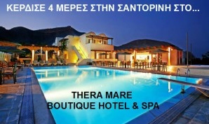 Το Thera Mare Boutique Hotel & Spa διοργανώνει διαγωνισμό και σας δίνει τη δυνατότητα να κερδίσετε 4 ημέρες (3 νύχτες) στο ξενοδοχείο για 2 άτομα, ένα γεύμα για 2 άτομα από τον AFROS Restaurant και μία εκδρομή με σκάφος για snorkeling.