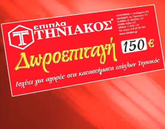 Tα έπιπλα Τηνιακός διοργανώνουν διαγωνισμό και δίνουν τη δυνατότητα σε 3 τυχερούς να κερδίσουν από μία δωροεπιταγή αξίας 150€ για αγορές στα καταστήματα επίπλων!