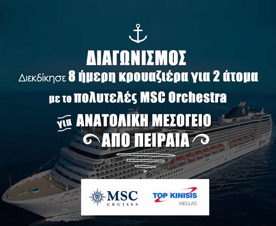 H Top Kinisis Hellas διοργανώνει διαγωνισμό και σας δίνει τη δυνατότητα να κερδίσετε μία 8ήμερη κρουαζιέρα για 2 άτομα, με το πολυτελές MSC Orchestra σε καμπίνα με μπαλκόνι με αναχώρηση από Πειραιά για Κέρκυρα, Κότορ, Βενετία, Μπάρι, Κατάκολο και Σαντορίνη από Μάιο – Ιούλιο 2016!