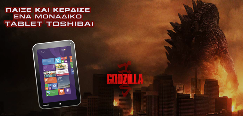 Η σελίδα Toshiba Greece διοργανώνει διαγωνισμό και δίνει τη δυνατότητα σε 20 τυχερούς κάθε εβδομάδα να κερδίσουν από μια σακούλα με δώρα εμπνευσμένα από την ταινία GODZILLA (μπρελόκ, μπλοκ, μπρελόκ, stickers, μαγνητάκια) και σε 1 τυχερό να κερδίσει ένα Toshiba Encore με Windows 8.1 στο τέλος του διαγωνισμού.