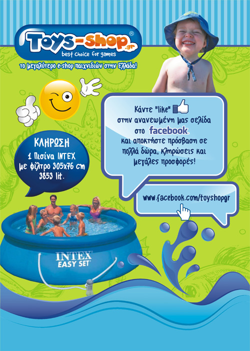 To toys-shop.gr διοργανώνει διαγωνισμό στο Facebook και σας δίνει τη δυνατότητα να κερδίσετε 1 παιδική πισίνα INTEX με φίλτρο διαστάσεων 305x76cm και χωρητικότητας 3853 λίτρων