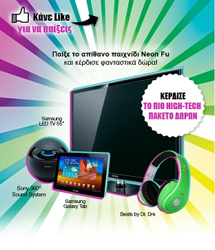 - Χάλκινο μεγάλο βραβείο (0 μοναδικοί παίκτες Neon Fu): Samsung Galaxy Tab 10 ιντσών 32 GB WiFi +3G και ηχοσύστημα 360° Sony με Bluetooth SRS-BTV25 συνολικής αξίας 720 ευρώ.
